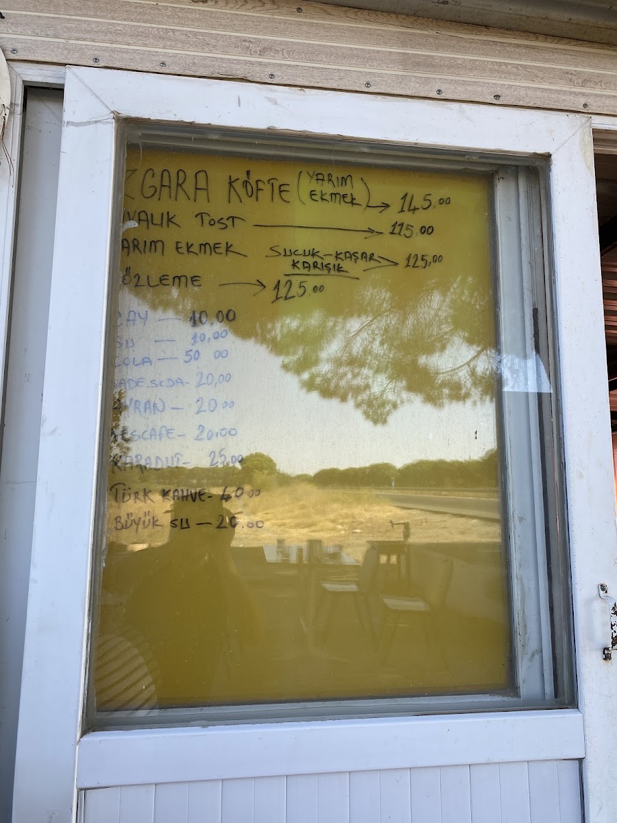 The menu boasts a selection of local delicacies, with highlights including the köfte ekmek—a savory meatball sandwich that locals love for its rich flavors and generous portions—priced at just 100 TL. Complement your meal with a refreshing karadut suyu (black mulberry juice), a cold and revitalizing drink that perfectly quenches your thirst for only 25 TL. Don't forget to pair your meal with a warm cup of çay (tea) to complete your experience at just 10 TL.